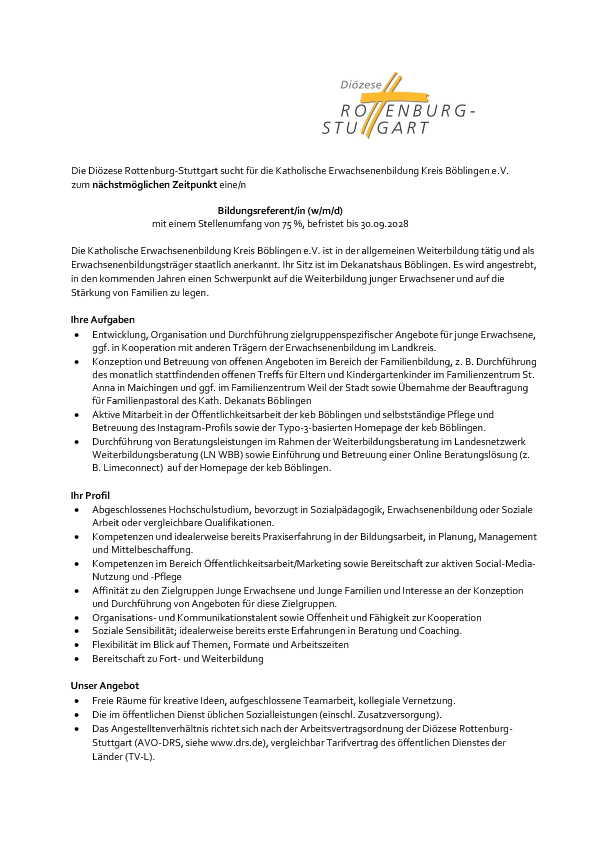 Die Diözese Rottenburg-Stuttgart sucht für die Katholische Erwachsenenbildung Kreis Böblingen e.V.